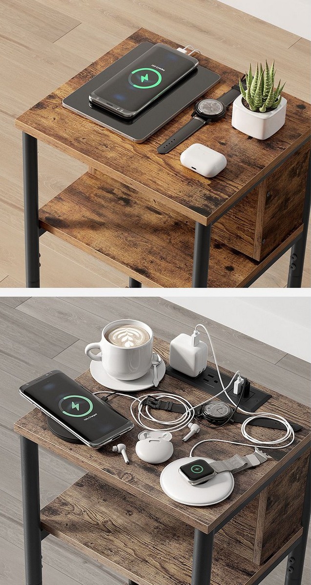 Odkládací stolek s vestavěnými zásuvkami a USB porty ROD 34x30 cm hnědá/černá