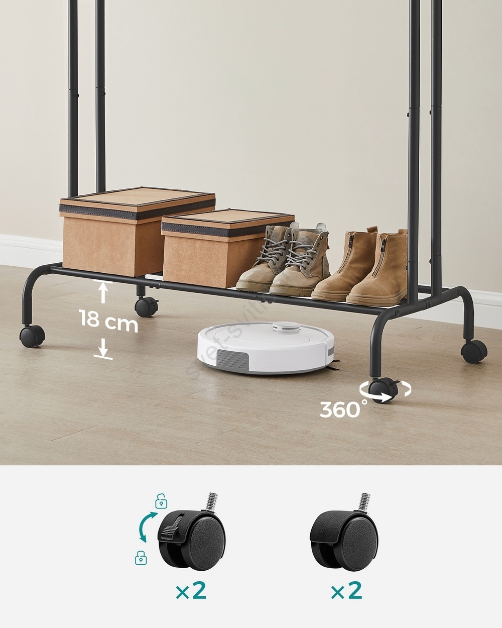• 4 odolná PP kolečka (2 brzdy) usnadňují přemisťování nebo ponechání celého stojanu v klidu.
