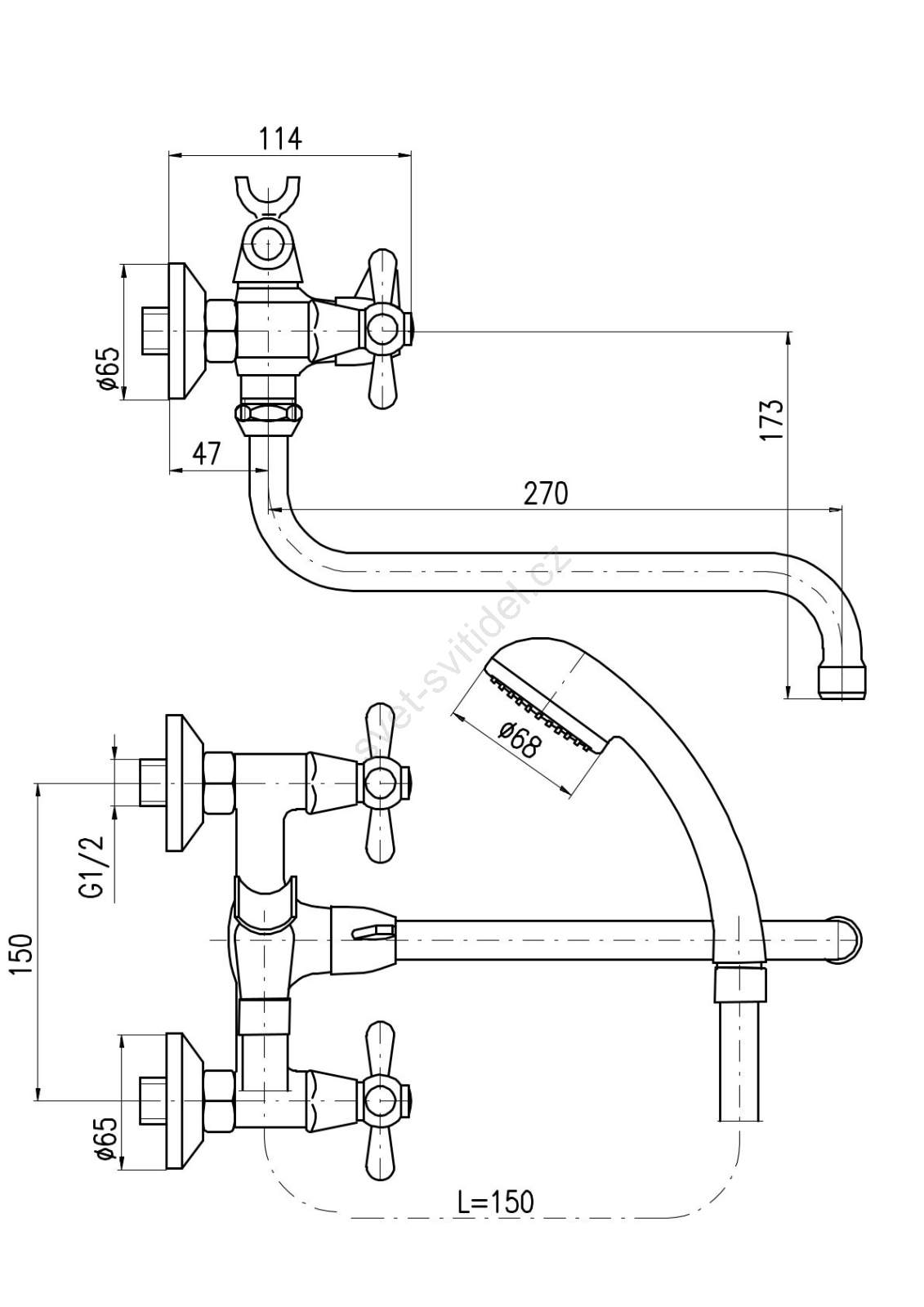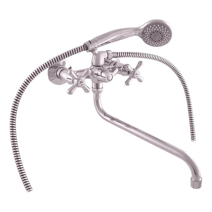• Vanový set s nástěnnou vanovou baterií s keramickým přepínačem, kulatým ramínkem, sprchou a vidlicí na odkládání sprchy.