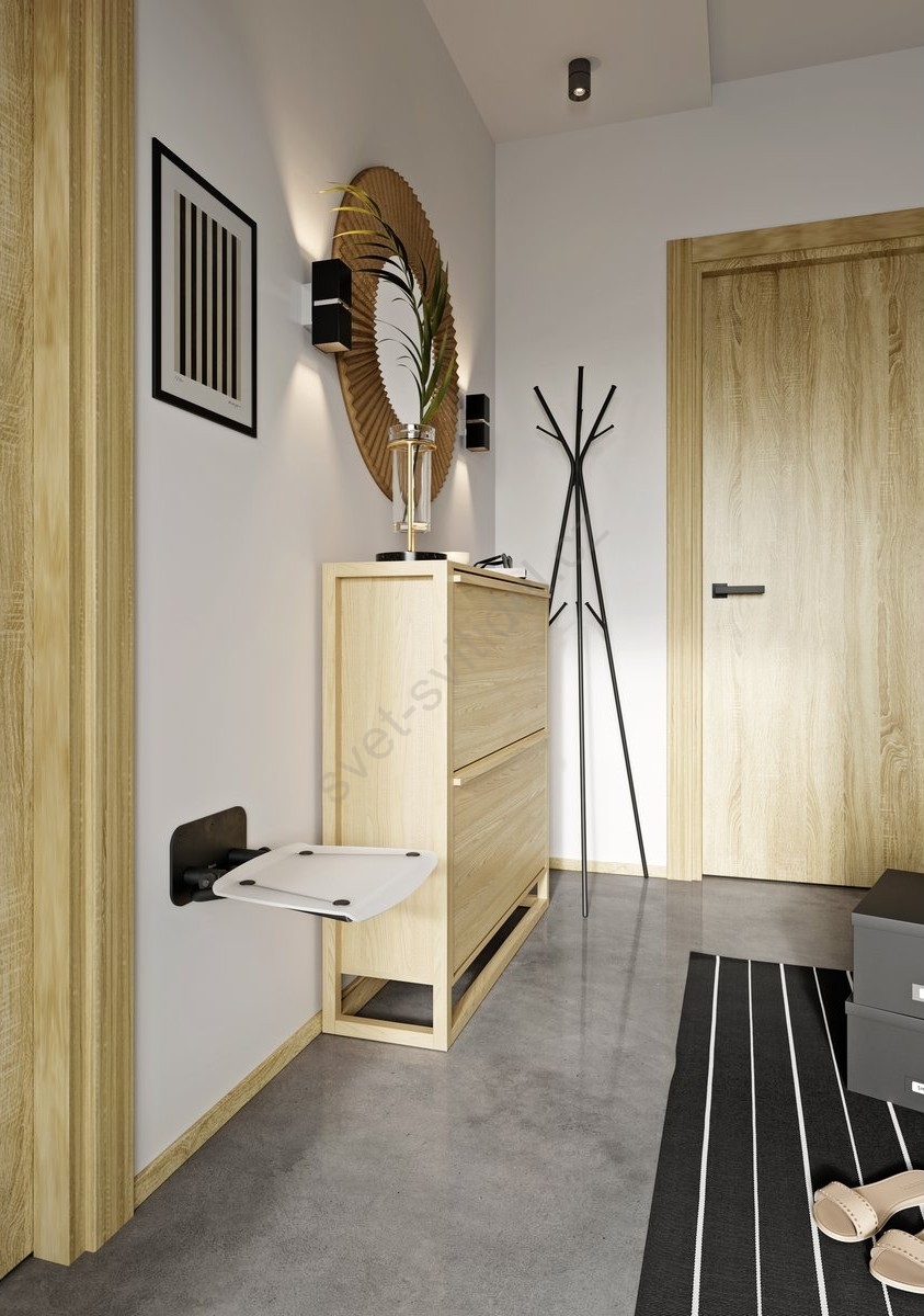 • Sedátko lze jednoduše sklopit ke stěně, čímž šetří prostor a zachovává volnost pohybu ve sprše.