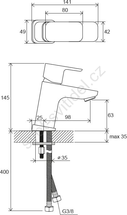 • Baterie je dodávána bez výpusti a obsahuje flexibilní připojovací hadičky o délce 450 mm s průměrem G3/8.
