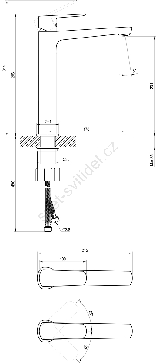 • Baterie je dodávána bez výpusti a obsahuje flexibilní připojovací hadičky o délce 450 mm s průměrem G3/8.