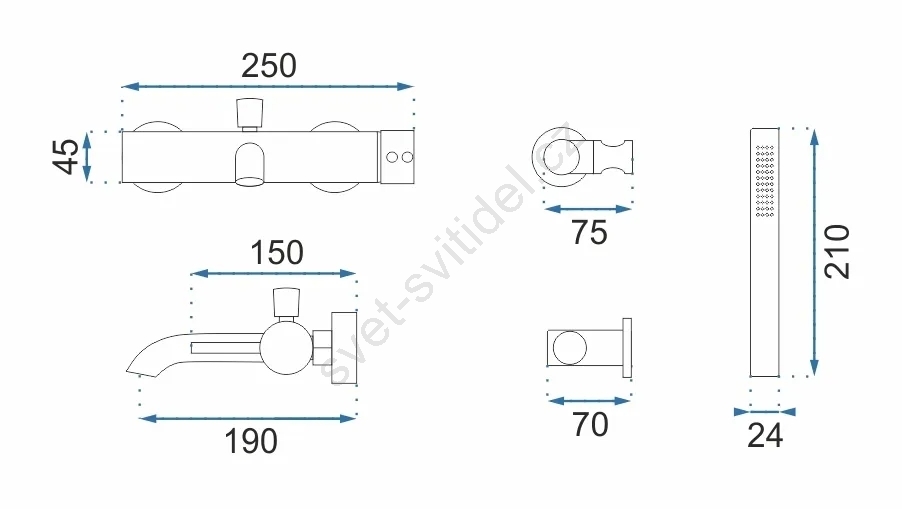 • Sada obsahuje: vanovou baterii, ruční sprchu, sprchovou hadici (190 mm), držák ruční sprchy.