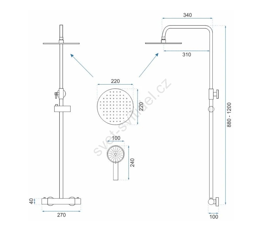 • Balení obsahuje: termostatickou baterii, ruční a hlavovou sprchu, držák, 150cm hadici.