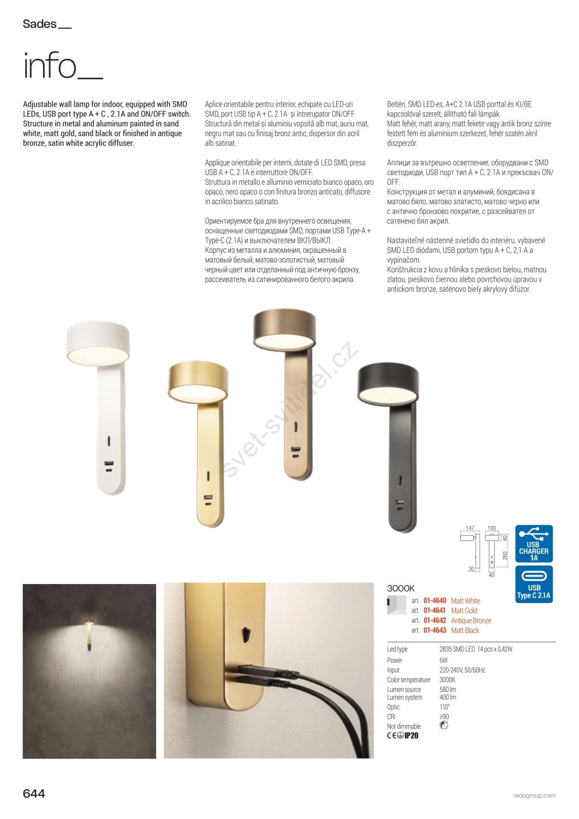 • Redo 01-4641 - LED Nástěnné svítidlo SADES LED/6W/230V CRI 90 USB zlatá