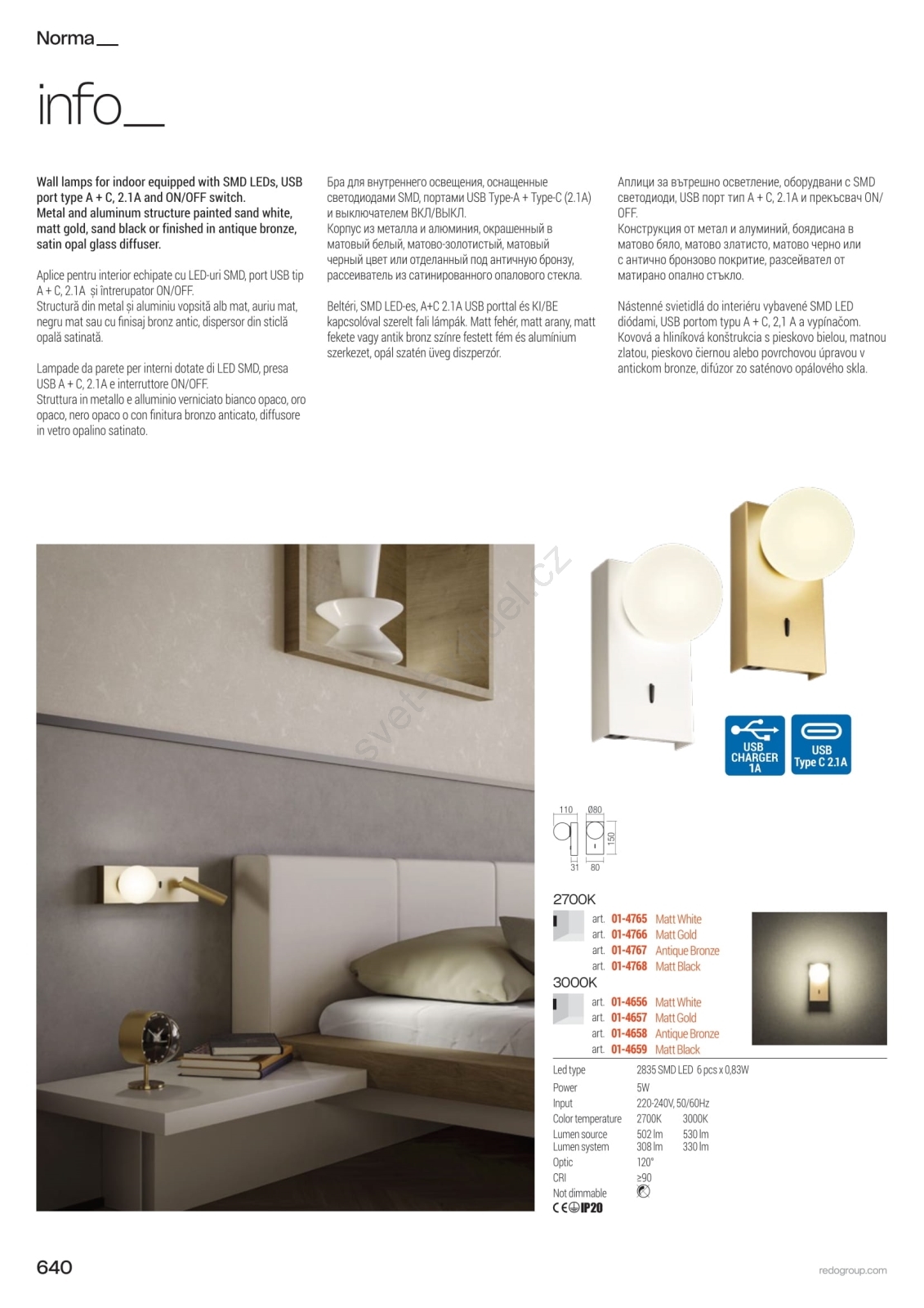 • Redo 01-4661 - LED Nástěnné svítidlo NORMA LED/5W/230V + LED/3W CRI 90 USB bílá/zlatá