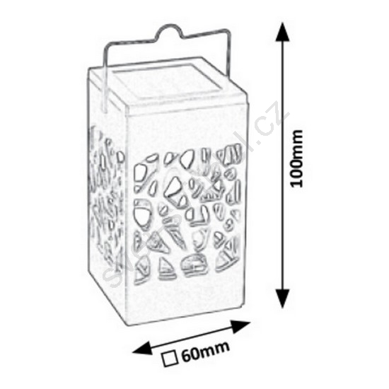 Solární lampa Mora bude velmi útulným doplňkem vaší verandy nebo zahrady. Můžete ji položit na podlahu, na stůl nebo ji někde zavěsit. Černé závěsné dekorativní svítidlo je vyrobeno z plastu a jeho vestavěný světelný zdroj LED vytváří teplé bílé světlo. Energeticky úsporný zdroj energie je 0,07 W, jeho svítivost je 1,2 lumenů, teplota jeho barvy je 3000 K a životnost je 20 000 hodin. Údaje o solárních článcích: AAA NiMH 200 mAh. Výška čtvercového vnějšího dekorativního svítidla 60x60 mm je 100 mm. Má ochranu IP23, tj je chráněno proti proniknutí, jestliže jsou předměty s maximálním průměrem 12 mm (např. prsty) a proti pronikání dešťové vody do 60°.