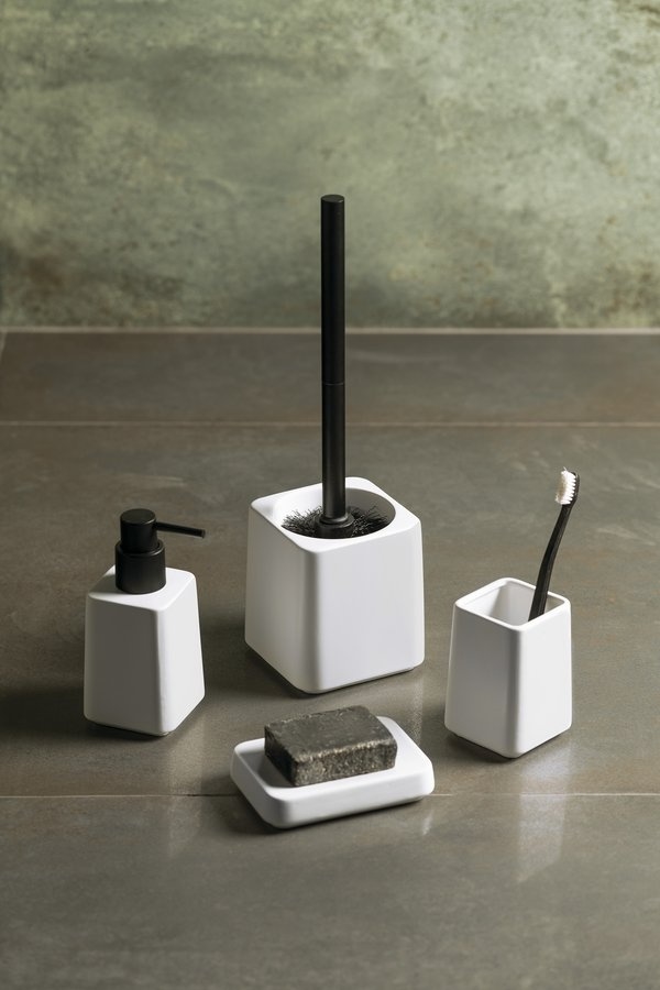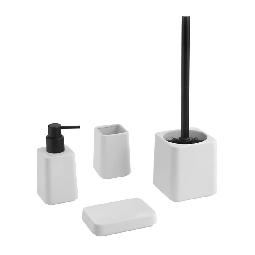 • Sada koupelnových doplňků obsahuje mýdlenku, sklenku, dávkovač a wc štětku.