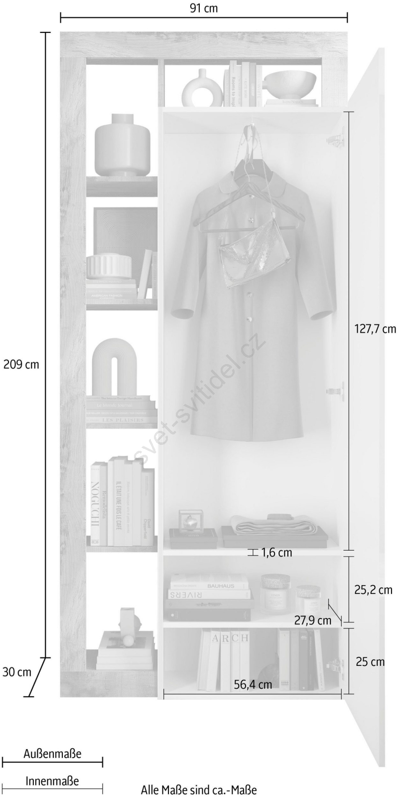 • Skříň disponuje 6 otevřenými policemi, šatní tyčí a 2 vnitřními policemi na uložení tašek a sezónních věcí.