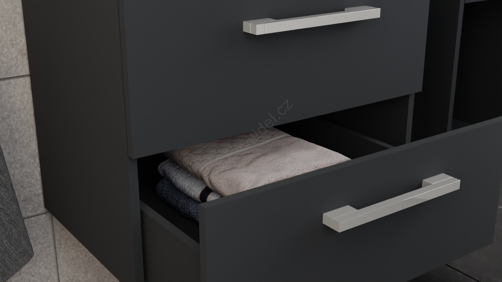 • Skříňka pod umyvadlo nabízí dvě praktické zásuvky, přičemž její horní část je navržena tak, aby maximálně využila prostor kolem baterie a odpadního potrubí.
