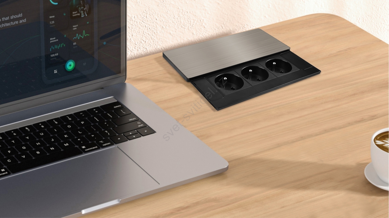 • Vestavný blok zásuvek s posuvným krytem, určený pro montáž do pracovní desky nebo stolu.