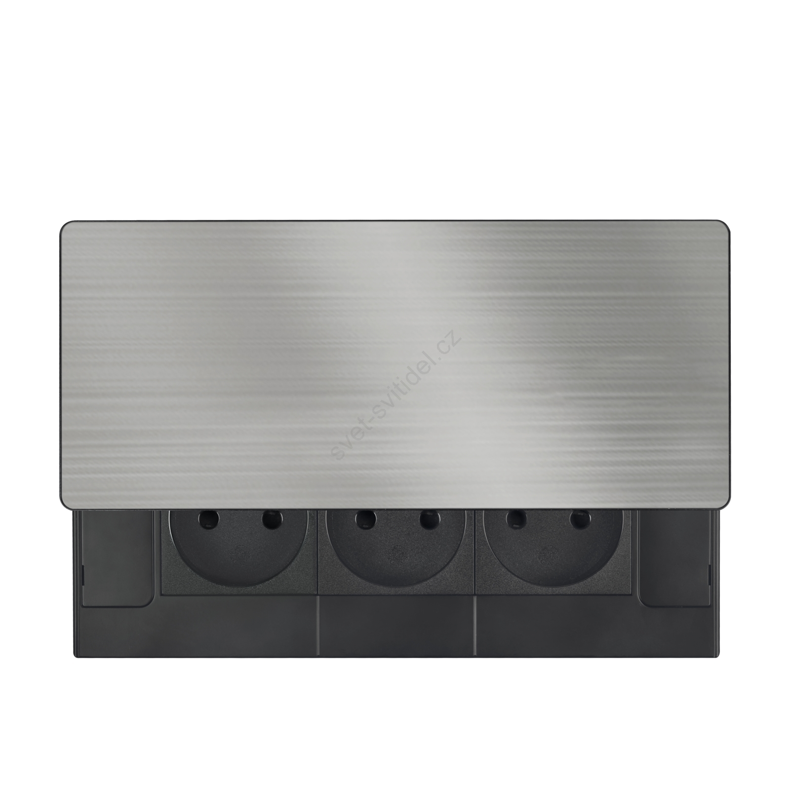 • Vrchní kryt je z matného tmavě nerezového materiálu (inox) a má posuvný mechanismus, který chrání zásuvky před prachem a nečistotami.