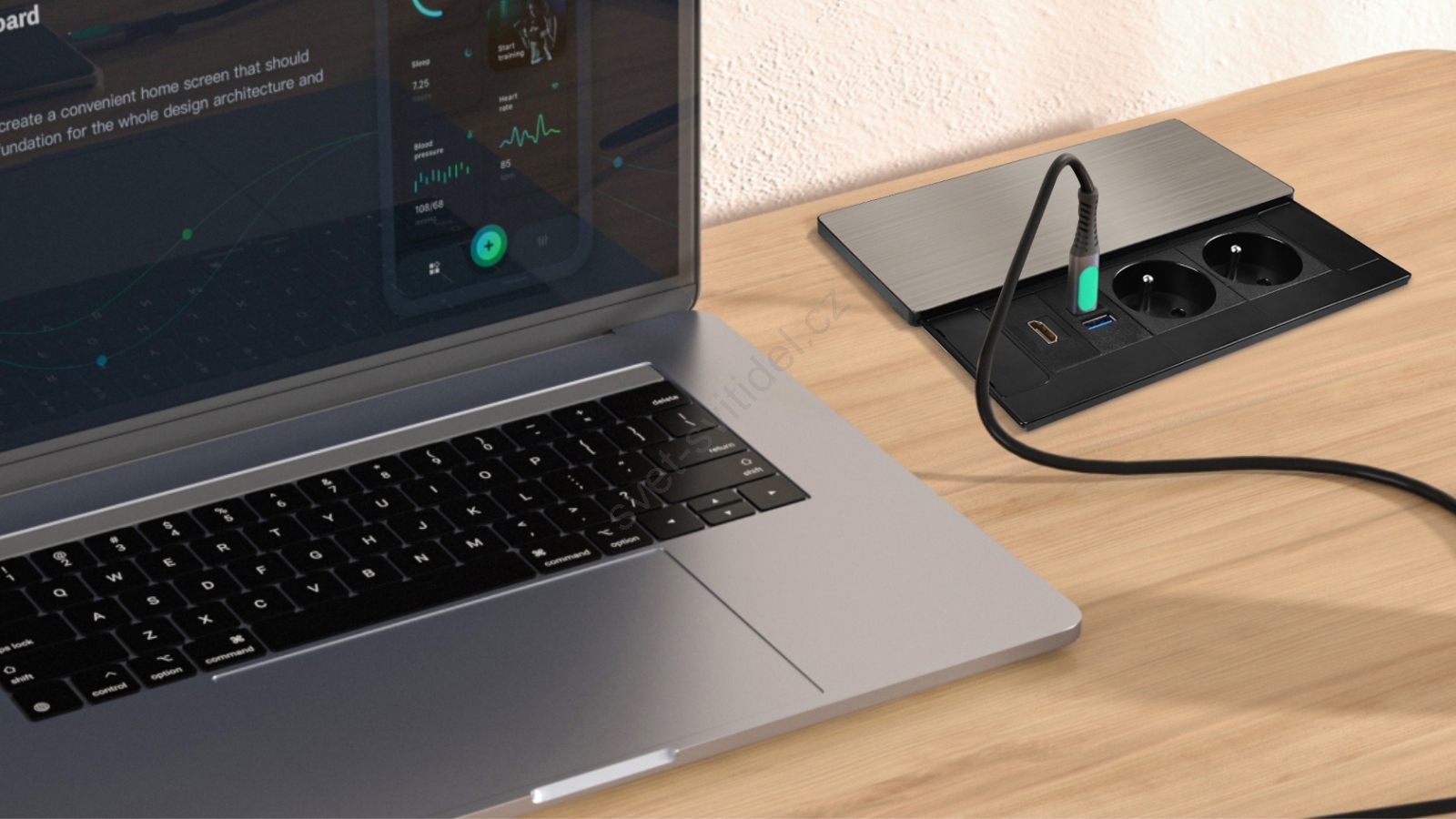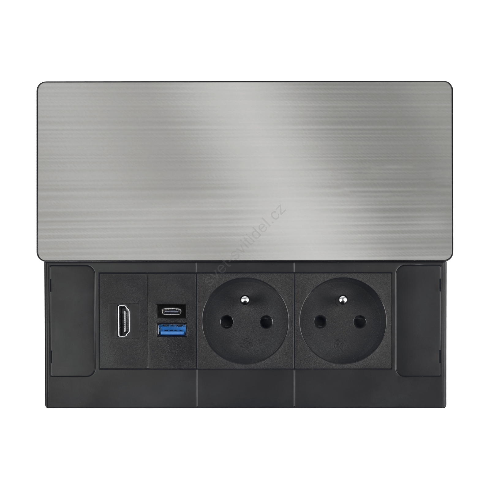 • Vrchní kryt je z matného tmavého nerezu s posuvným mechanismem, který chrání zásuvky a porty před prachem a nežádoucím zanášením.