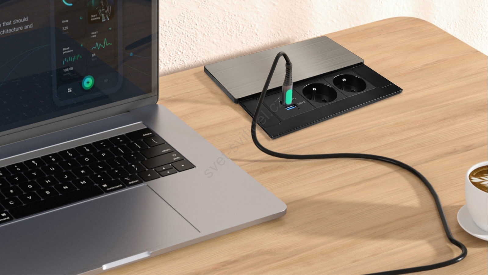 • Vestavný blok zásuvek s posuvným krytem, určený pro montáž do pracovní desky nebo nábytku tak, aby zůstal hladce zapuštěný, když není použit.