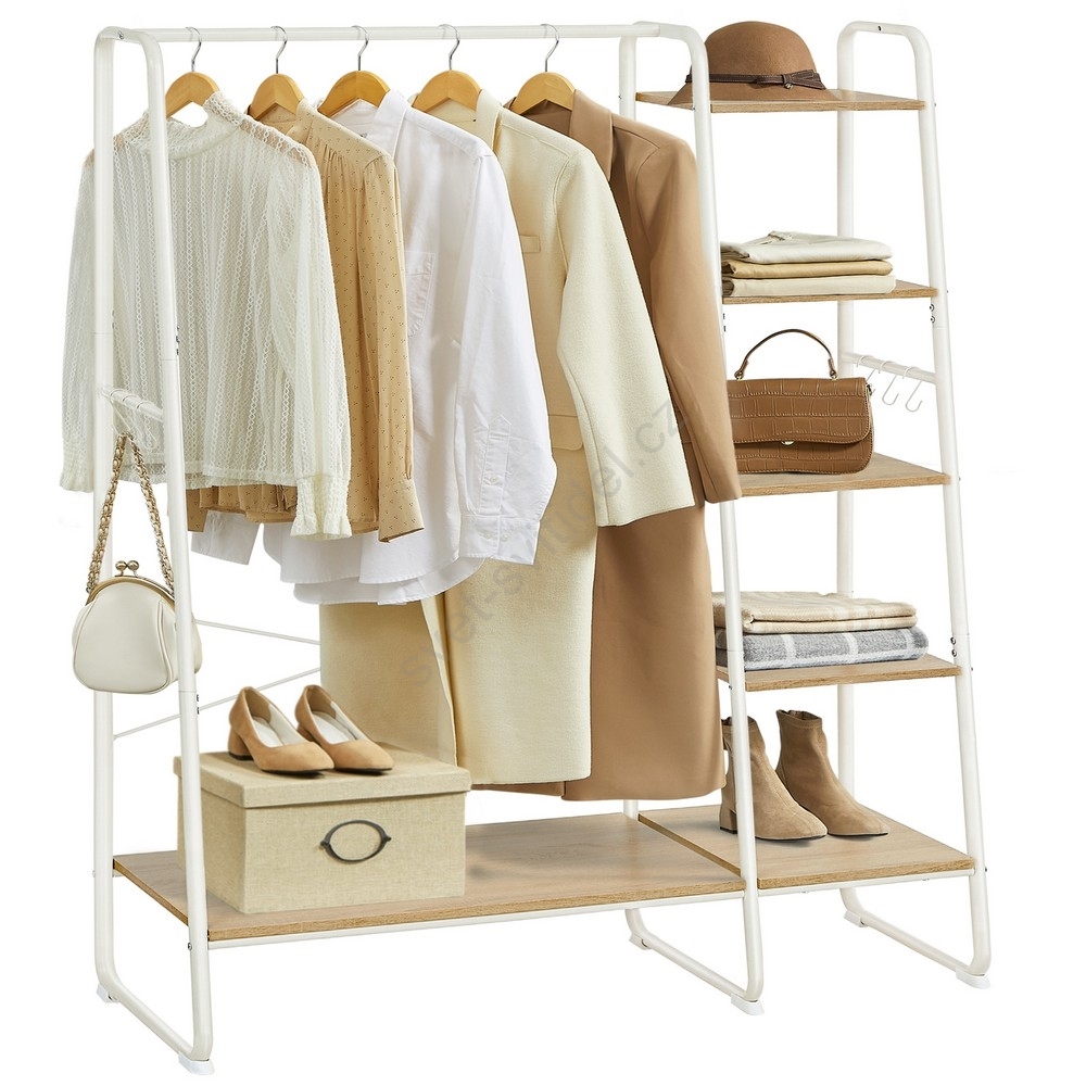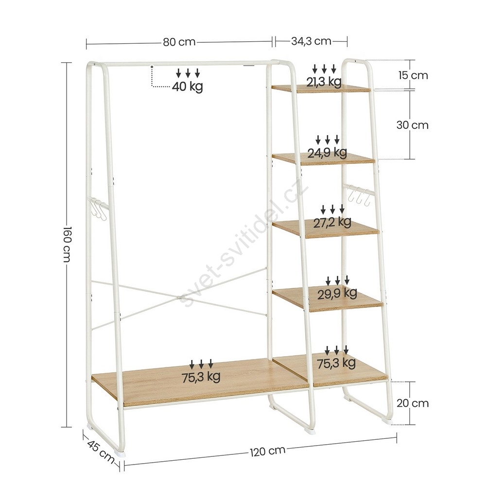 • Pověste si bundy, košile a kalhoty na horní tyči po celé délce, na 6 úložných polic si uložte tašky, boty, krabice,  klobouky, šály, deštníky a další potřebné věci.