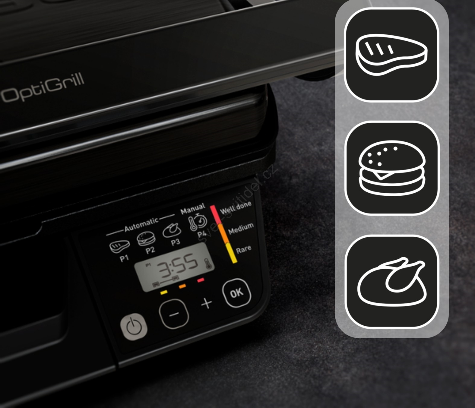 • Tři automatické programy (červené maso, burgery, drůbež) + manuální režim pro vlastní nastavení teploty a času.