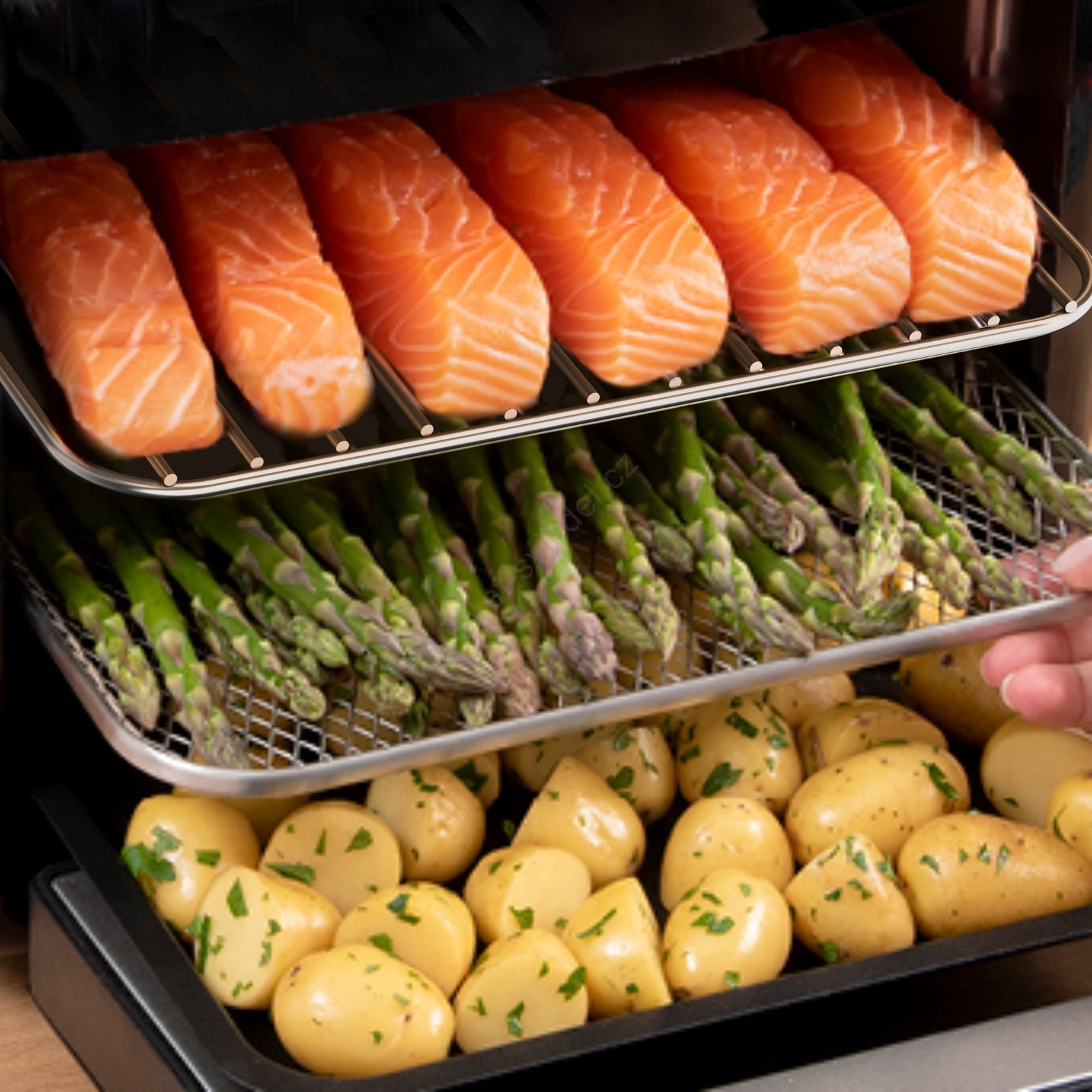 • Velký objem 15 litrů se třemi výškovými úrovněmi pro více pokrmů najednou.