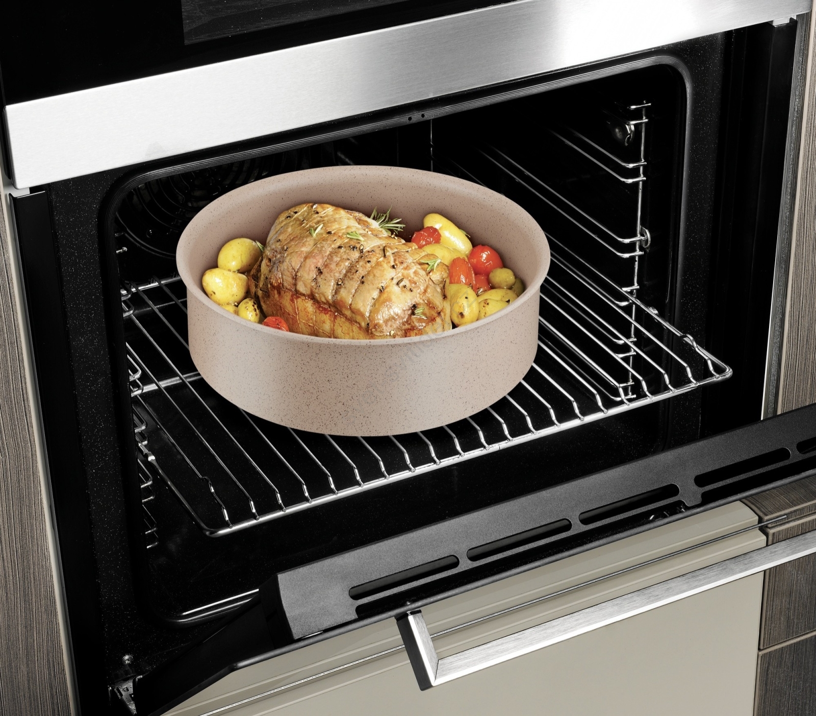 • Konstrukce je navržena s odnímatelnou rukojetí, která umožňuje efektivní skladování, používání v troubě i servírování bez držadle.