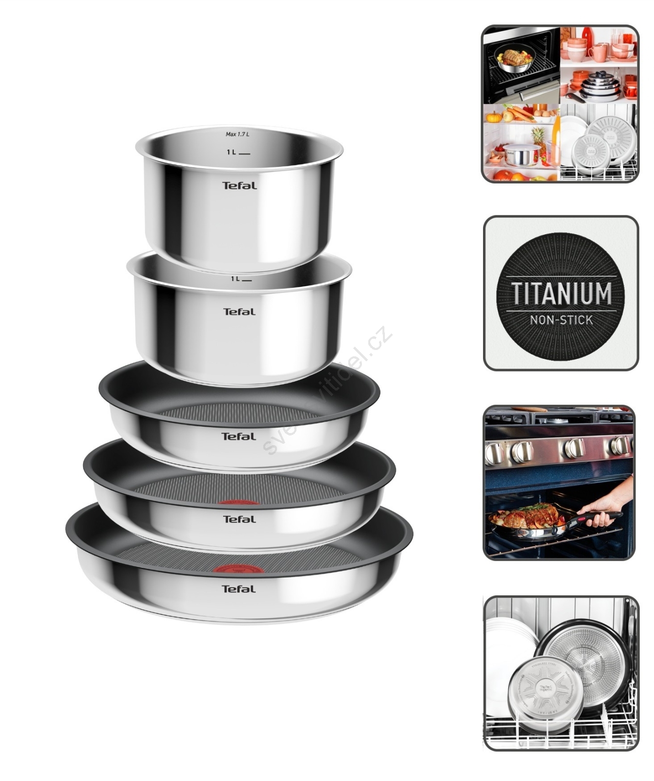 • Sada Tefal obsahuje tři pánve (22 cm, 24 cm a 28 cm), dva rendlíky (16 cm a 18 cm) a odnímatelnou rukojeť.