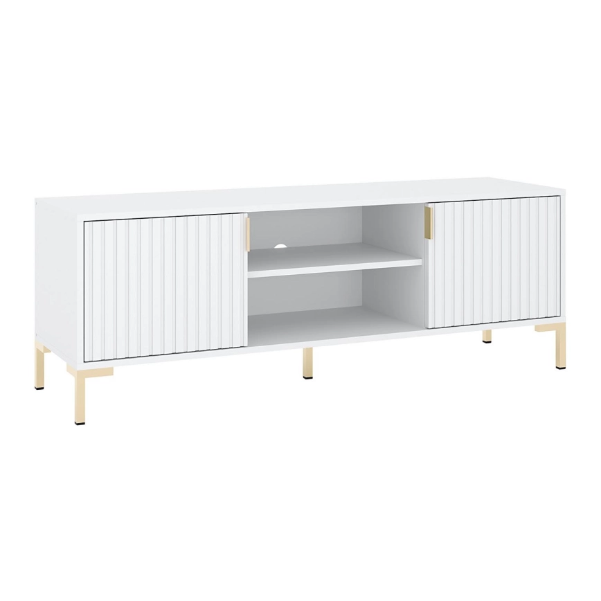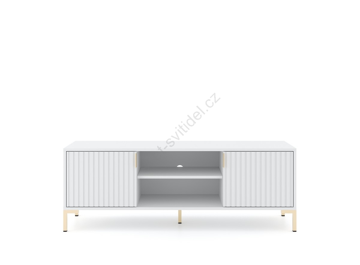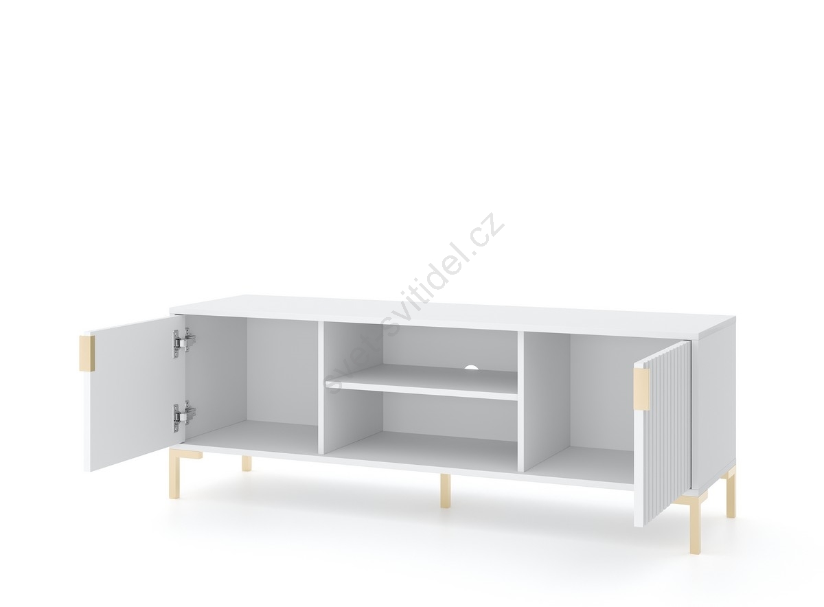 • Má dvě uzavřené boční přihrádky, každá se dvířky se symetrickými úchytkami, s žebrováním a dvě otevřené police s otvorem pro kabel, uprostřed.