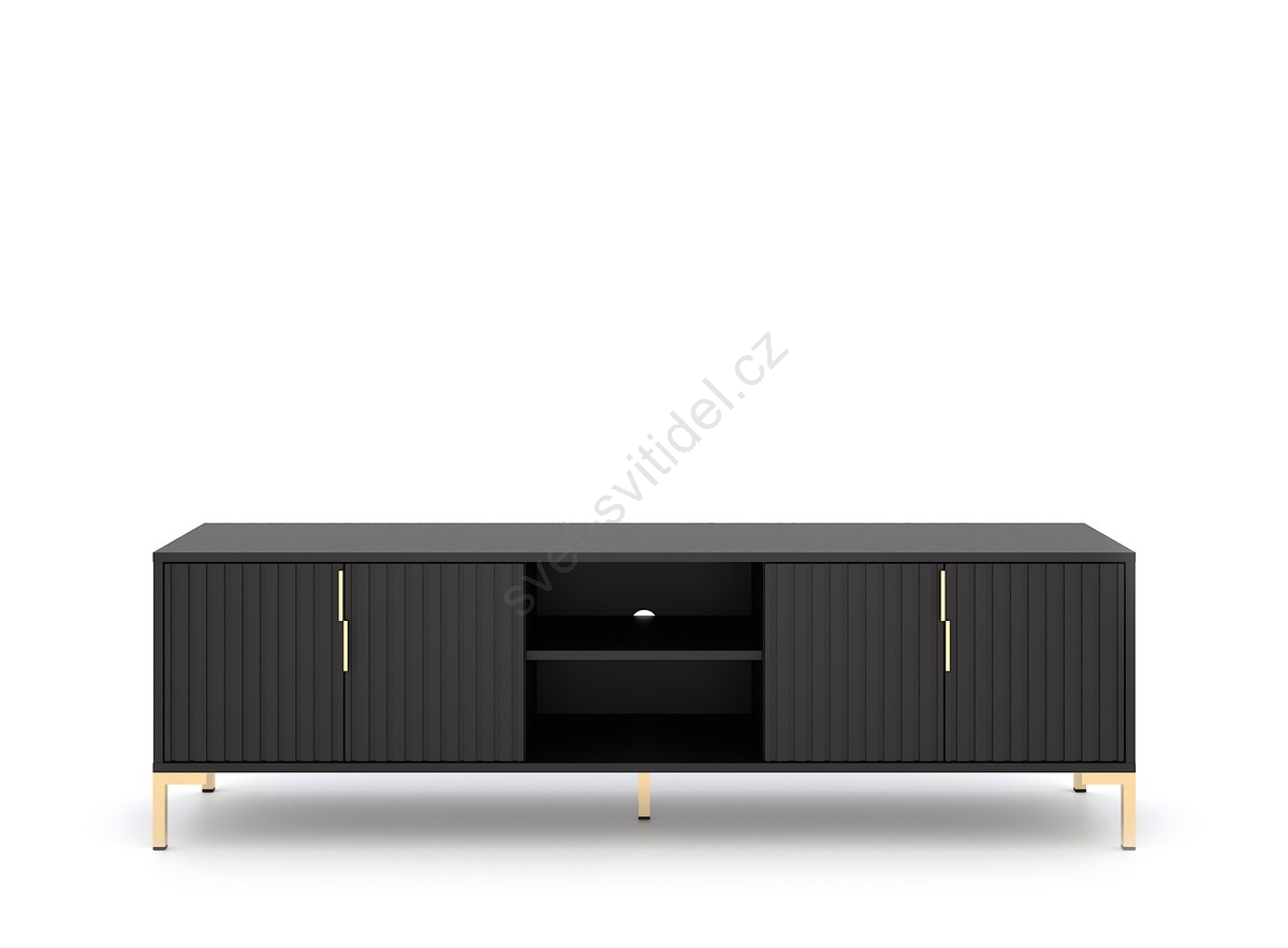 • Má dvě uzavřené boční přihrádky, každá se dvěma dvířky se symetrickými úchytkami, s žebrováním a dvě otevřené police s otvorem pro kabel, uprostřed.