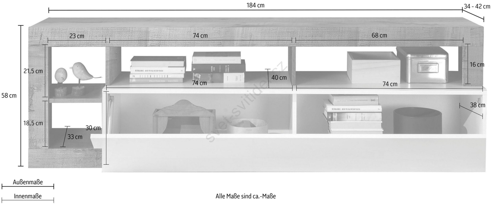 • Spodní přihrádka a otevřené police nabízí prostor pro knihy, dekorace a domácí potřeby.