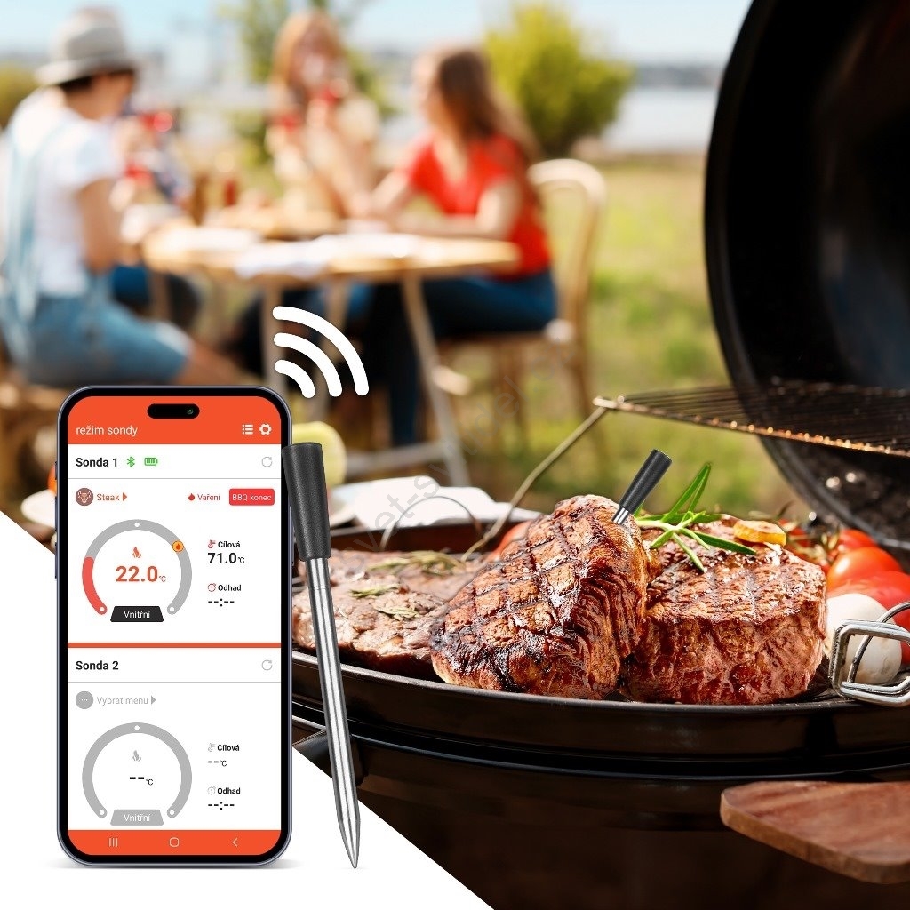 • Teploměr stačí vpíchnout do masa a v aplikaci nastavit požadované parametry, jakmile bude hotovo, dostanete upozornění.