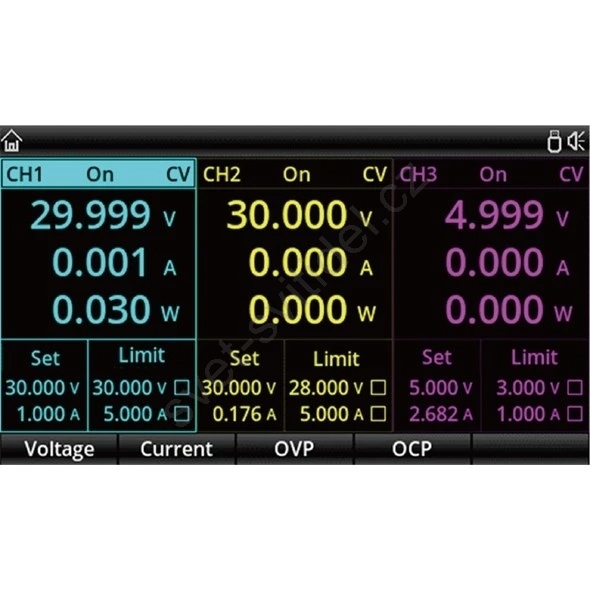 • Výstupní napětí: CH1/CH2: 0 ~ 30V DC CH3: 0 ~ 6V DC CH4: 5V DC.