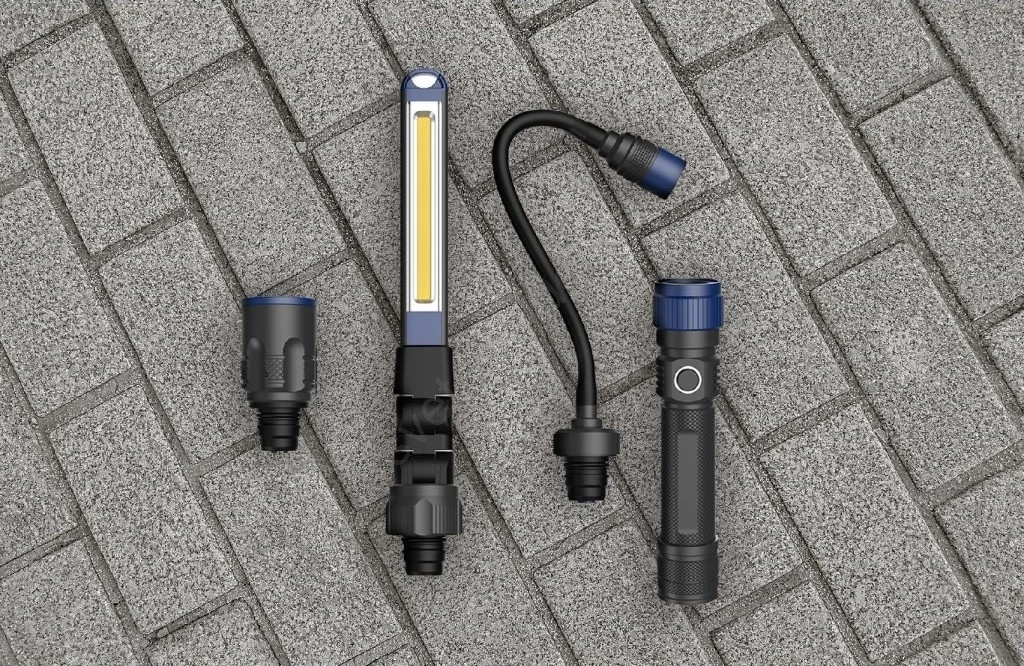 • Nabízí svítivost 380 lm a tři vyměnitelné hlavice (standardní, ohebná, LED pásek).