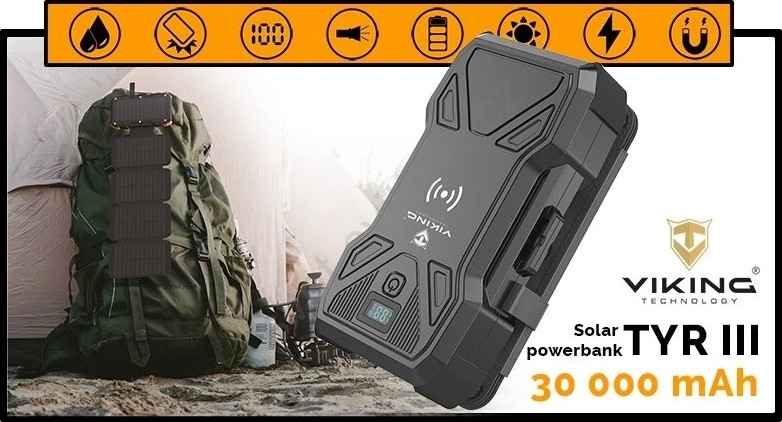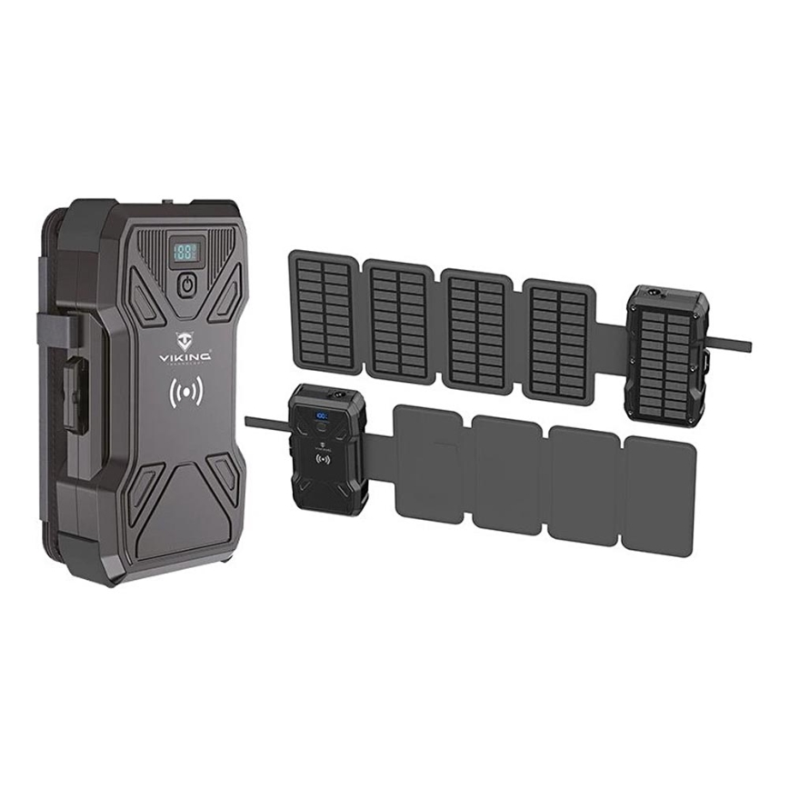 Viking - Power Bank s LED svítilnou, bezdrátovým nabíjením a solárním panelem Power Delivery 22,5W/30000 mAh