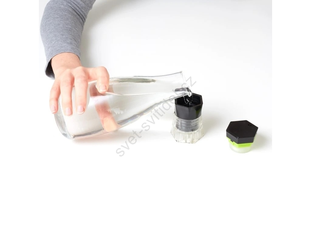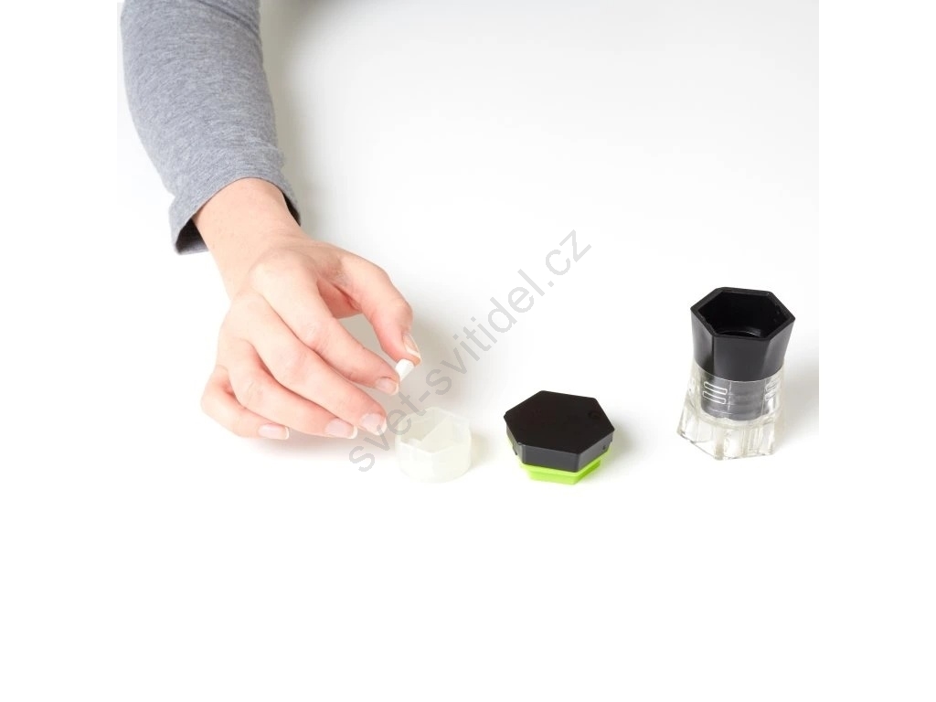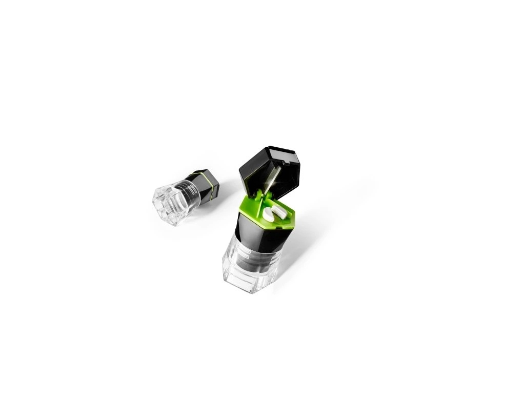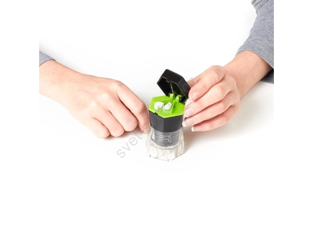 • Dávkovač má průhledné provedení s černými a zelenými detaily a dokonale usnadňuje manipulaci s medikací.