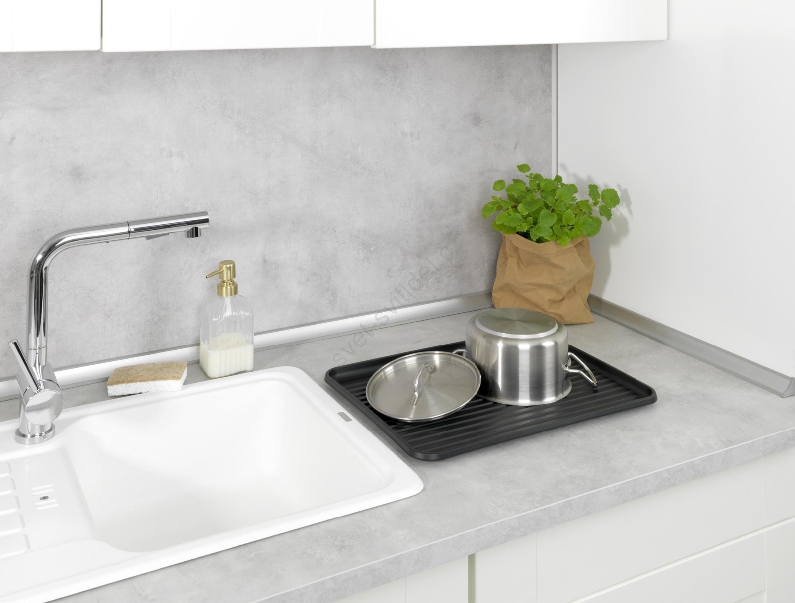 • Odnímatelná odkapávací miska z recyklovaného plastu zachytává vodu a chrání pracovní plochu.