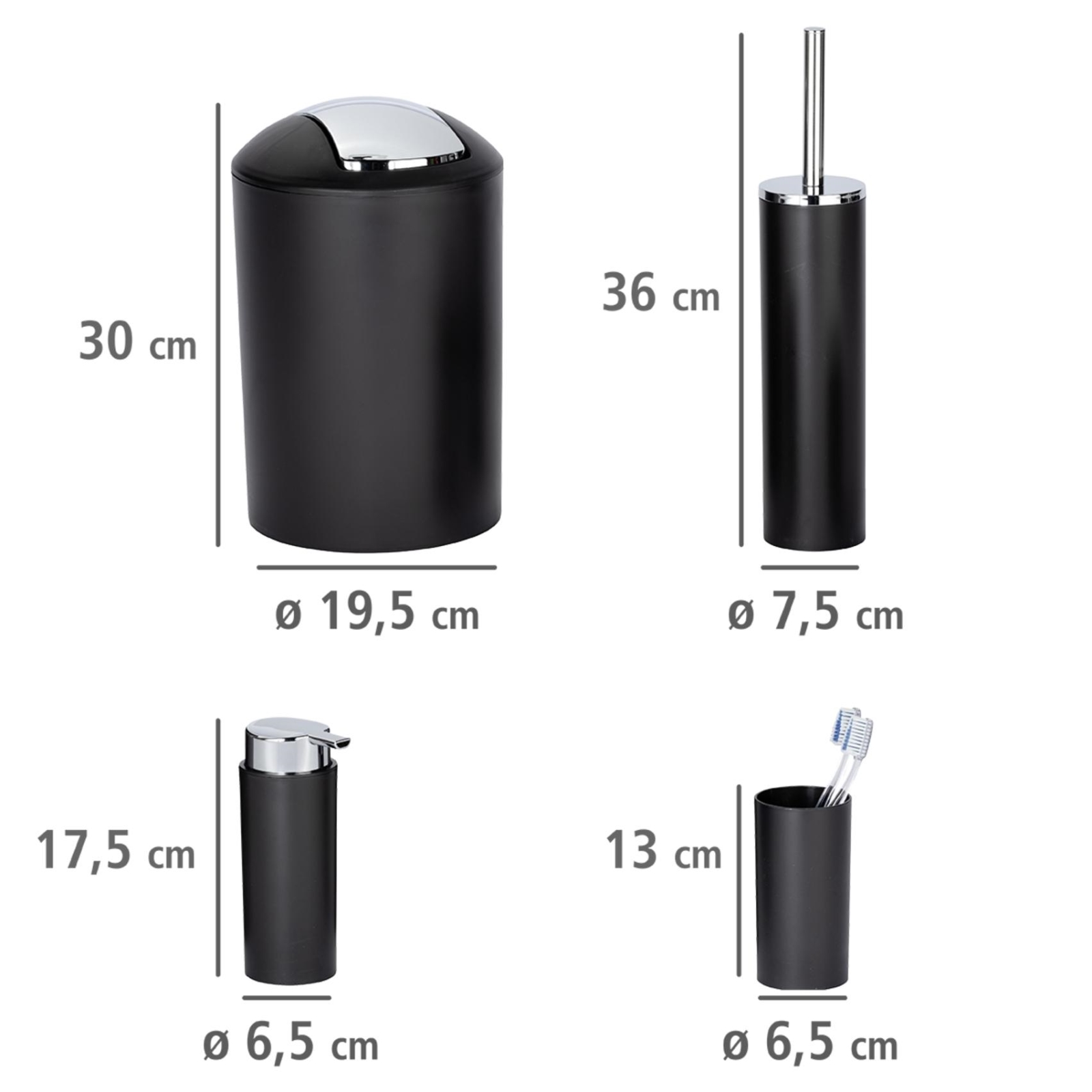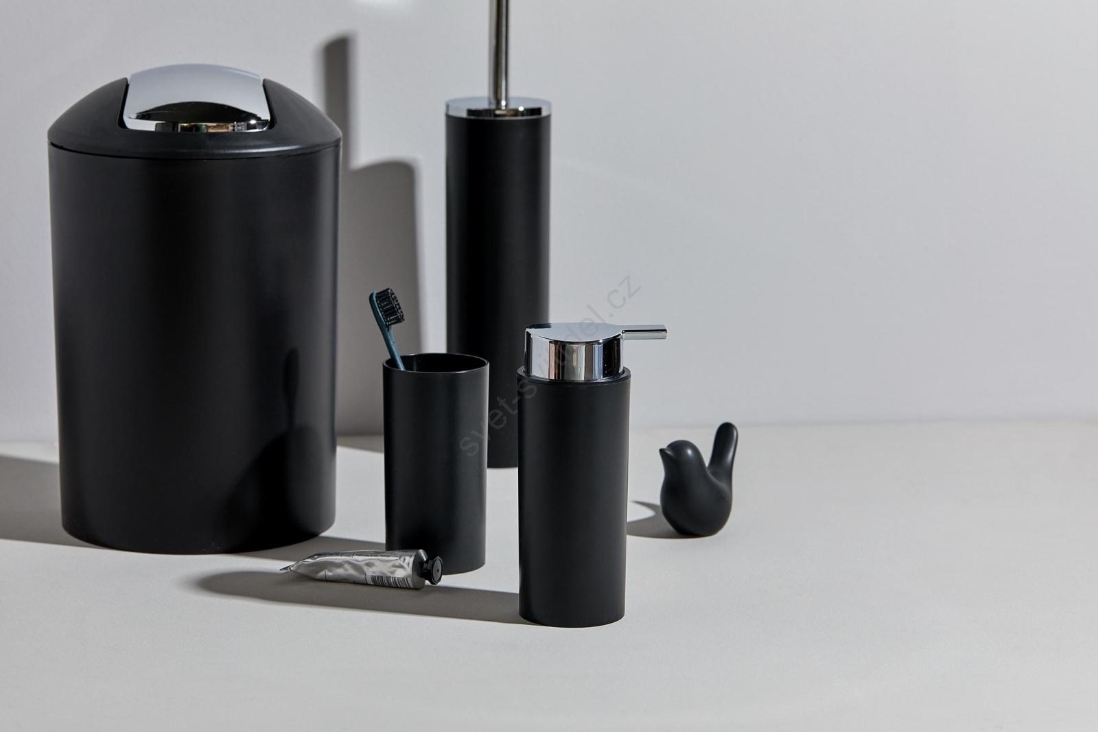 • Obsahuje dávkovač na mýdlo, kelímek na kartáčky, WC set a kosmetický koš.