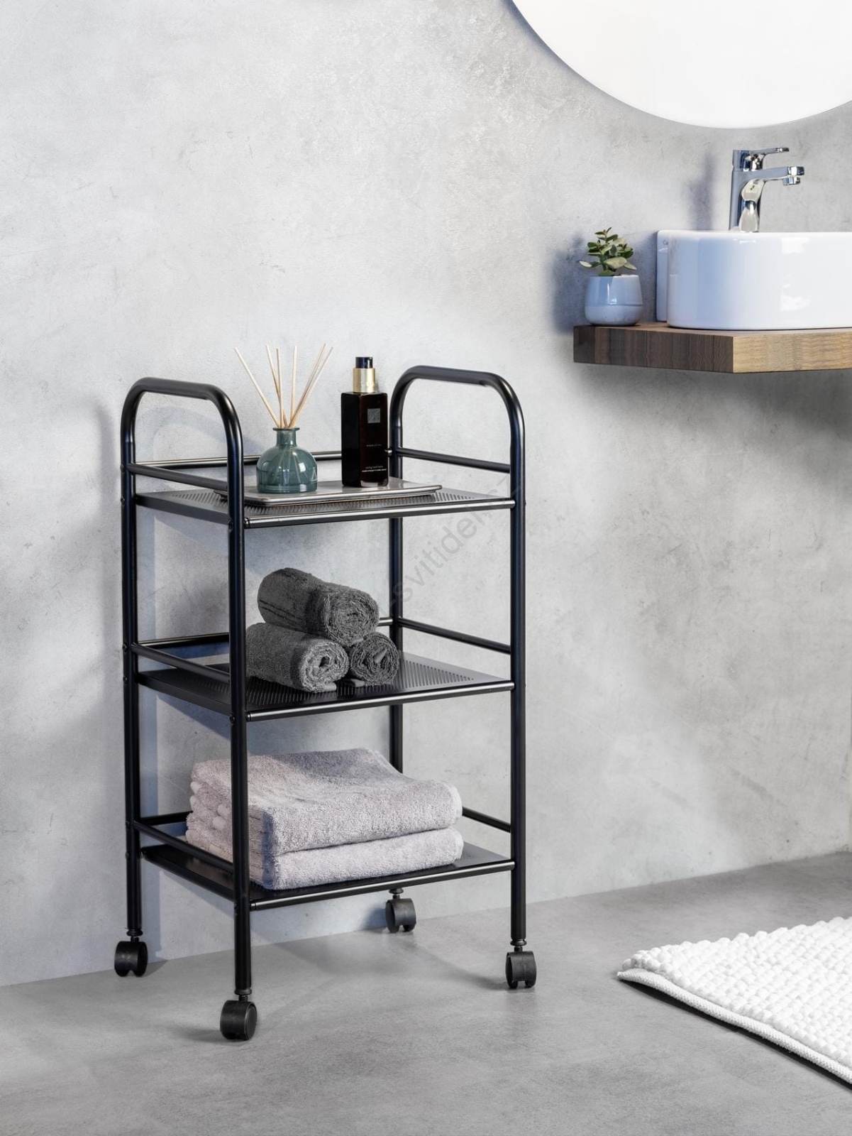 • Elegantní koupelnový vozík se třemi policemi pro praktické uspořádání.