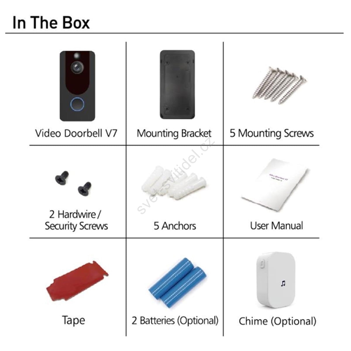 • Součástí balení: bezdrátový zvonek, montážní konzole, přijímač (zvonek), oboustranná montážní páska, montážní šrouby, bezpečnostní šrouby, nabíječka, hmoždinky, 2 baterie, uživatelská příručka.