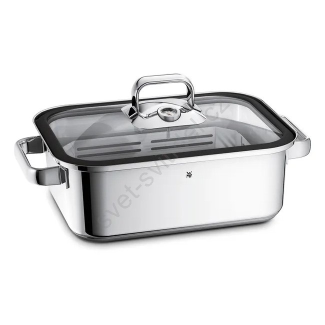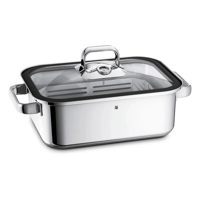 • Skleněná poklice se silikonovým těsněním a integrovaným teploměrem – umožňuje přesnou kontrolu vaření v páře.